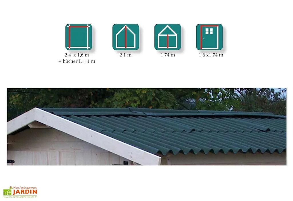 Ce cabanon de jardin possède une double porte de 1,60 x 1,74 m (l,h) livrée avec un loquet pour cadenas. Deux lucarnes fixes sont intégrées aux portes et sont équipées d’un vitrage en PVC transparent. Le toit est recouvert par des plaques ondulées bitumées, pour une meilleure tenue dans le temps. L’abri seul mesure 2,40 x 1,60 x 1,74 (l,l,h), pour des dimensions hors tout de 2,70 x 1,87 x 2,10 m (l,l,h). Sa surface utile intérieure est de 3,7 m². Le bûcher mesure 0,96 x 1,60 m (l,l,) et ses dimensions hors tout sont de 1,11 x 1,87 m (l,l). Les dimensions hors tout de l’abri avec bûcher sont de 3,36 x 1,60 x 2,10 m (l,l,h).