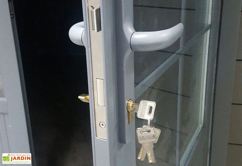 L’abri de jardin en bois comprend une grande double porte battante avec une ouverture de 144 x 195 cm (l,h). Cette porte est équipée de double vitrage, d’une structure en aluminium, de poignées et d’une serrure à clé.