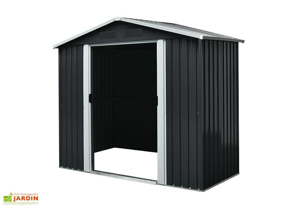 Idéal pour les petits espaces, cet abri de jardin en métal mesure 1,94 m de large sur seulement 1,31 m de profondeur. Il n’occupera ainsi que 2,54 m² et vous permettra de ranger du matériel de jardinage ou des outils, entre autres. Sa porte coulissante de 82 x 154 cm facilitera l’accès à l’intérieur de la cabane tandis que ses grilles d’aération permettront le renouvellement de l’air, évitant ainsi tout excès d’humidité.