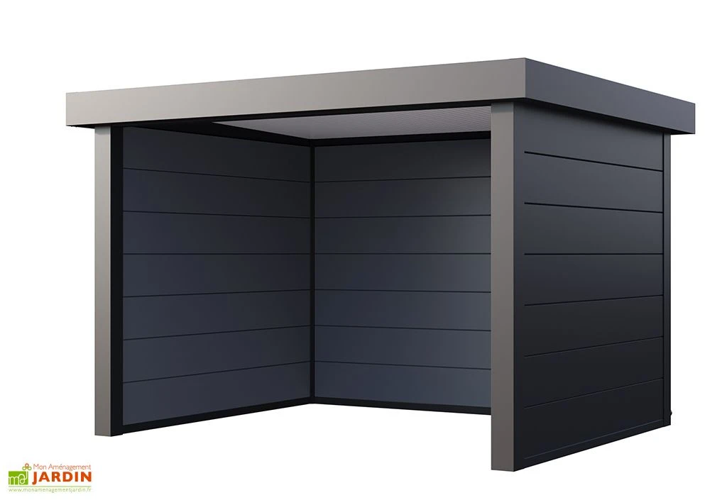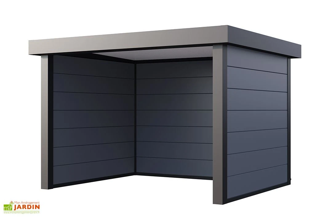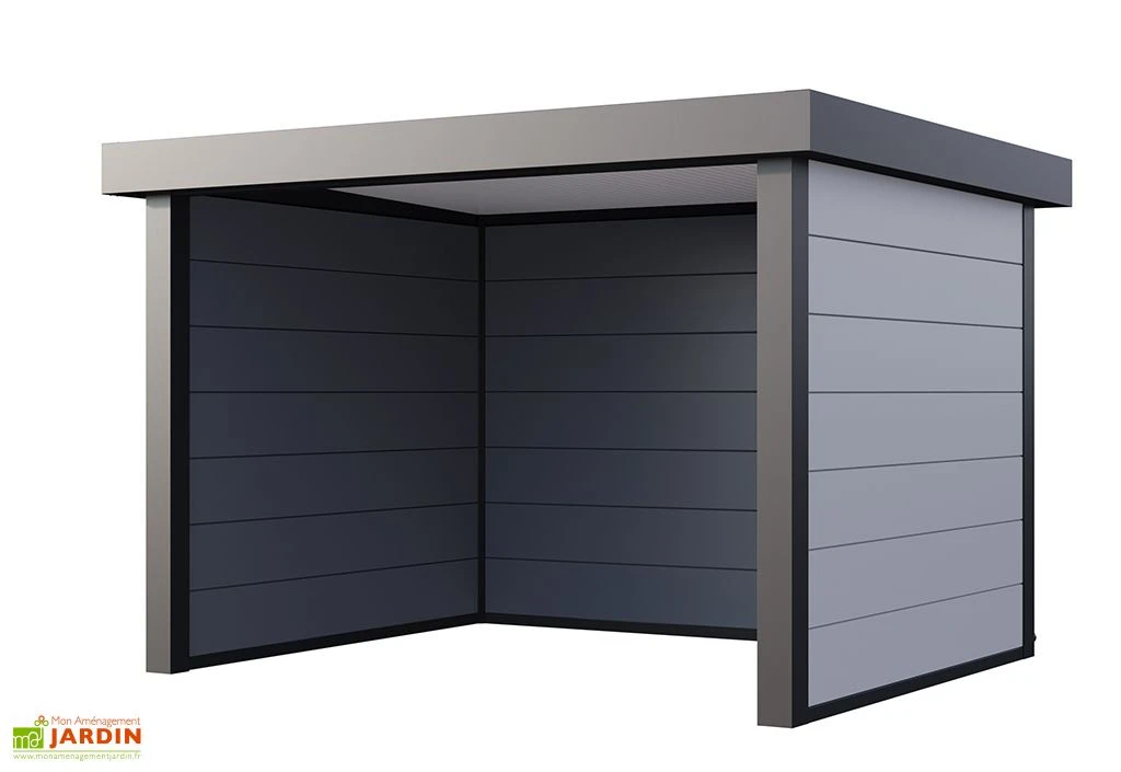 Avec son toit plat qui lui apporte un aspect moderne et contemporain, cet abri de jardin en métal affiche des dimensions extérieures de 358 x 298 x 265 cm et des dimensions intérieures de 330 x 285 x 265 cm. Facile à monter, il est également facile à aménager. Sa surface intérieure de 9,40 m² vous permettra d’y installer un salon d’extérieur ou même un petit jacuzzi !