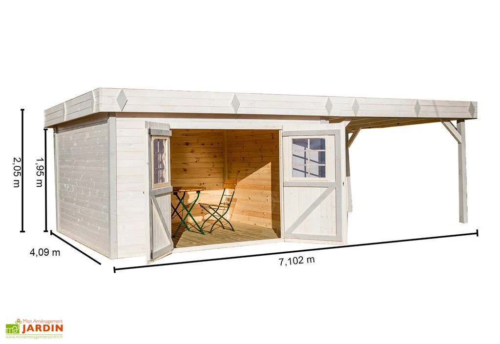 Les parois de cet abri sont constituées de madriers de 28 mm d’épaisseur à emboîter. Elles mesurent 1,95 m de haut et supportent un toit plat dont la faible pente de 2°, imperceptible à l’oeil nu, facilite l’écoulement des eaux pluviales. Cette toiture s’est en outre vue dotée d’un bac acier, très résistant, chargé d’assurer la bonne étanchéité de l’ensemble.