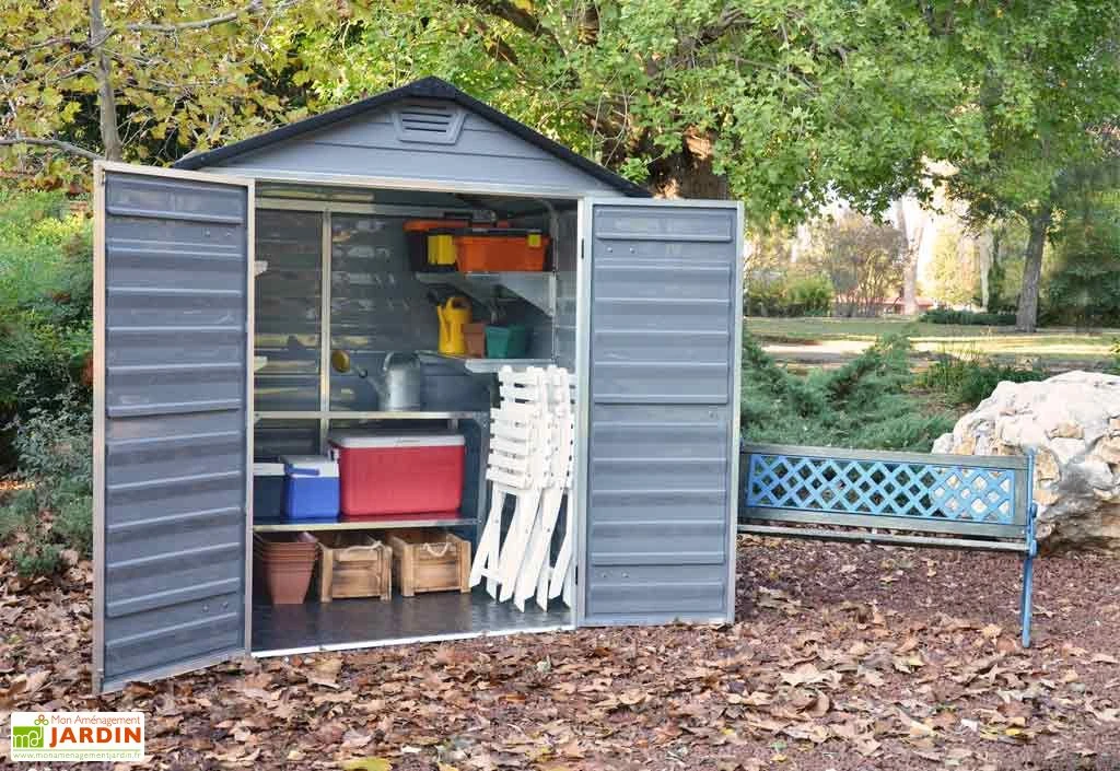 La double porte de l’abri de jardin, entouré d’un cadre en aluminium, mesure 1,27 x 1,71 m (l,h). Il est livré avec son plancher antidérapant. Il est équipé d’une ventilation en façade pour éviter la condensation. Les dimensions extérieures de votre abri sont de 1,85 x 1,53 x 2,17 m (l,l,h) pour des dimensions intérieures de 1,70 x 1,48 m et sa résistance à la neige est de 75 kg/m².