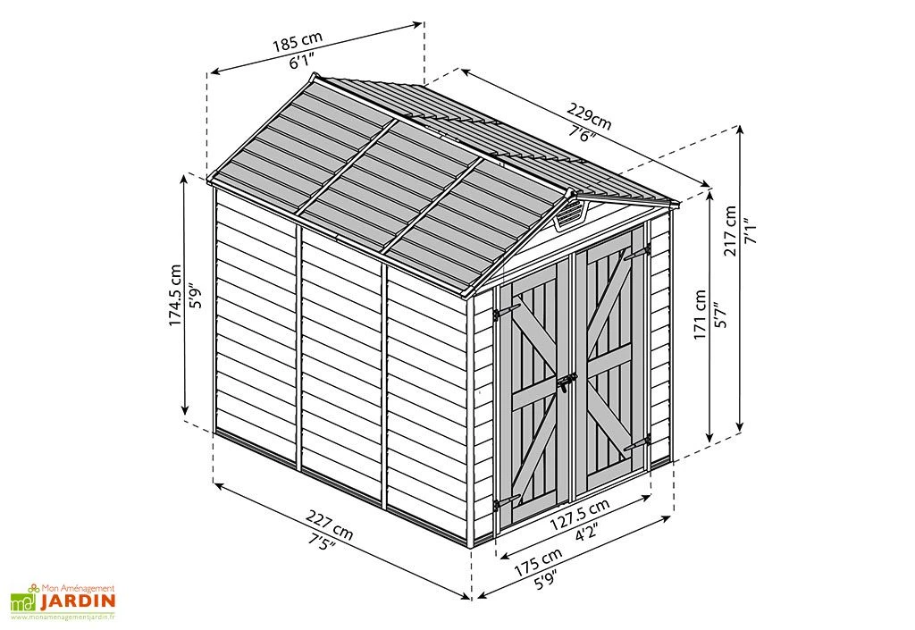 Les panneaux de polycarbonate de l’abri sont pratiquement incassables et insensibles aux chocs, grâce à leur grande flexibilité. Ils ne demandent aucun entretien. La cabane mesure 2,30 m de profondeur, 1,85 m de largeur et 2,17 m de hauteur, ce qui vous offre une surface de 4,28 m² vous permettant de stocker et protéger équipements et mobiliers de jardin ou encore vélos et outils.