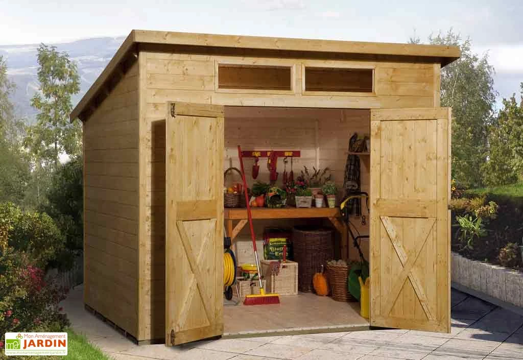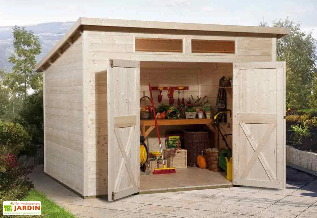 La double porte de votre abri mesure 1,50 x 1,80 m (l,h) et deux fenêtres se trouvent au dessus. Votre abri de jardin en bois est garanti 5 ans.