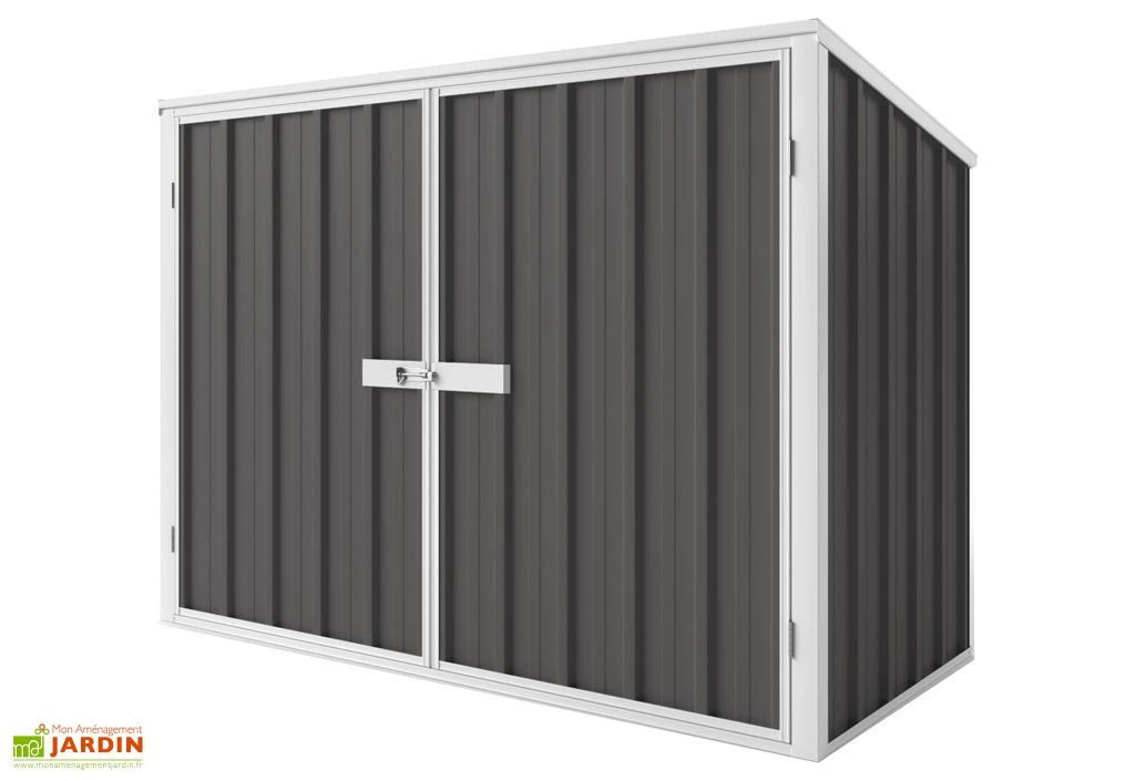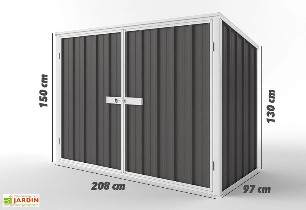Le coffre de rangement en métal multifonctions offre une capacité intérieure de rangement de 1,87 m². Il mesure 97 cm de profondeur, 208 cm de largeur, 130 cm de hauteur à l’arrière et 149 cm de hauteur à l’avant. Il est idéal pour ranger vélos, scooters ou tout votre outillage.