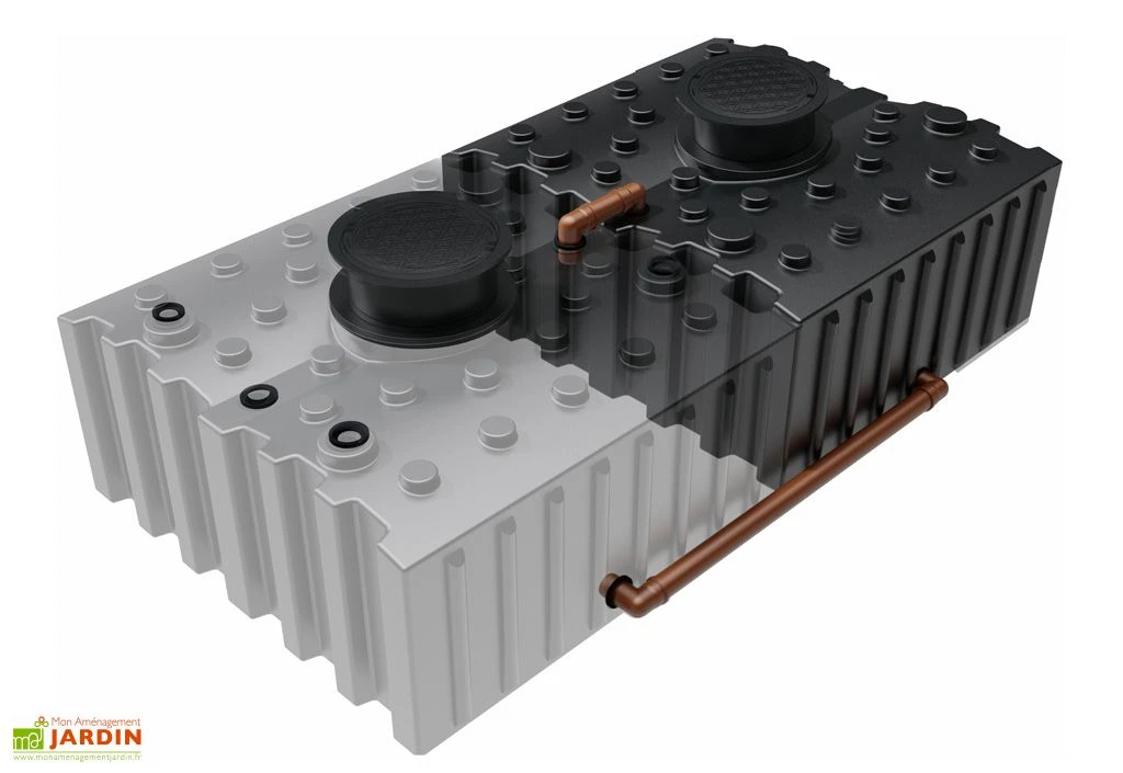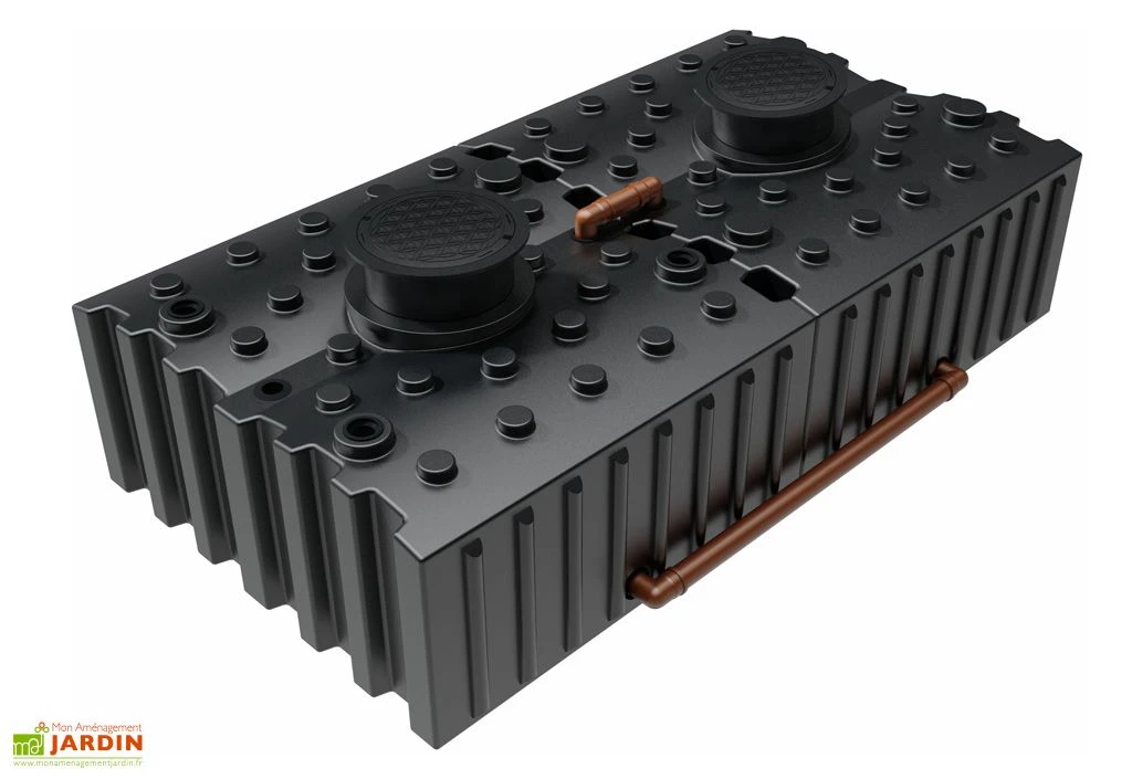 Le grand récupérateur d’eau de pluie enterré GreenLife est composé de 2 cuves plates de 5000 litres couplées l’une à l’autre. Il mesure au total 440 cm de longueur, 242 cm de largeur et 144 à 164 cm de hauteur. Il comprend 2 dômes de compensation extensibles en hauteur de 38 à 58 cm. Chaque dôme possède son couvercle de sécurité praticable pouvant supporter jusqu’à 200 kg.