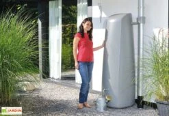La cuve de récupération d’eau de pluie comprend un couvercle double paroi en polyéthylène avec sécurité enfant qui permet un passage piéton (mais il n’est pas possible de rouler dessus). Elle dispose également d’une rehausse qui pivote à 360° et qui s’ajuste en hauteur entre 40 et 78 cm.