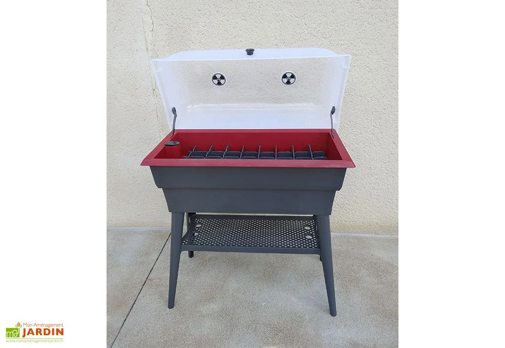 La jardinière mesure 81 cm de longueur et 39 cm de largeur. Avec la cloche elle mesure 100 cm de hauteur et sans la cloche elle mesure 80 cm de hauteur. Ce couvercle dispose de 3 charnières à l’arrière.