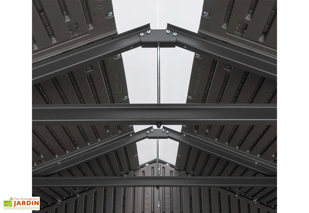 Côté couverture, cette cabane de jardin s’est vue dotée d’une toiture à deux pans imitation tuiles et d’une charpente en acier inoxydable. Elle intègre deux bouches d’aération, à l’avant et à l’arrière, ainsi qu’un puit de lumière central, sur toute la longueur du toit. Ce dernier, en complément de la fenêtre de 42 x 42 cm présente au niveau des parois, vous permettra de profiter d’un peu de luminosité une fois à l’intérieur de l’abri.