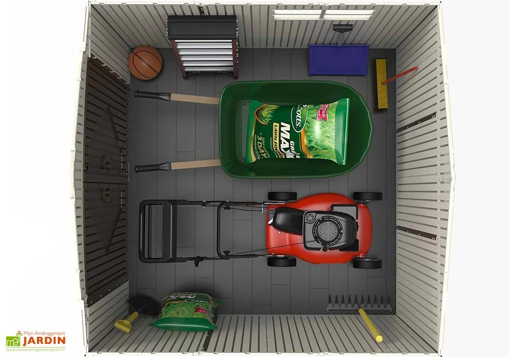 Afin de vous faciliter l’accès à l’intérieur du cabanon, ce dernier mobilise une large double porte de 138 x 192 cm. Vous pourrez ainsi circuler facilement, même avec des équipements relativement encombrants. Cette porte pourra par ailleurs être verrouillée pour sécuriser le contenu de l’abri. Notez enfin qu’un plancher antidérapant en PEHD est également inclus.