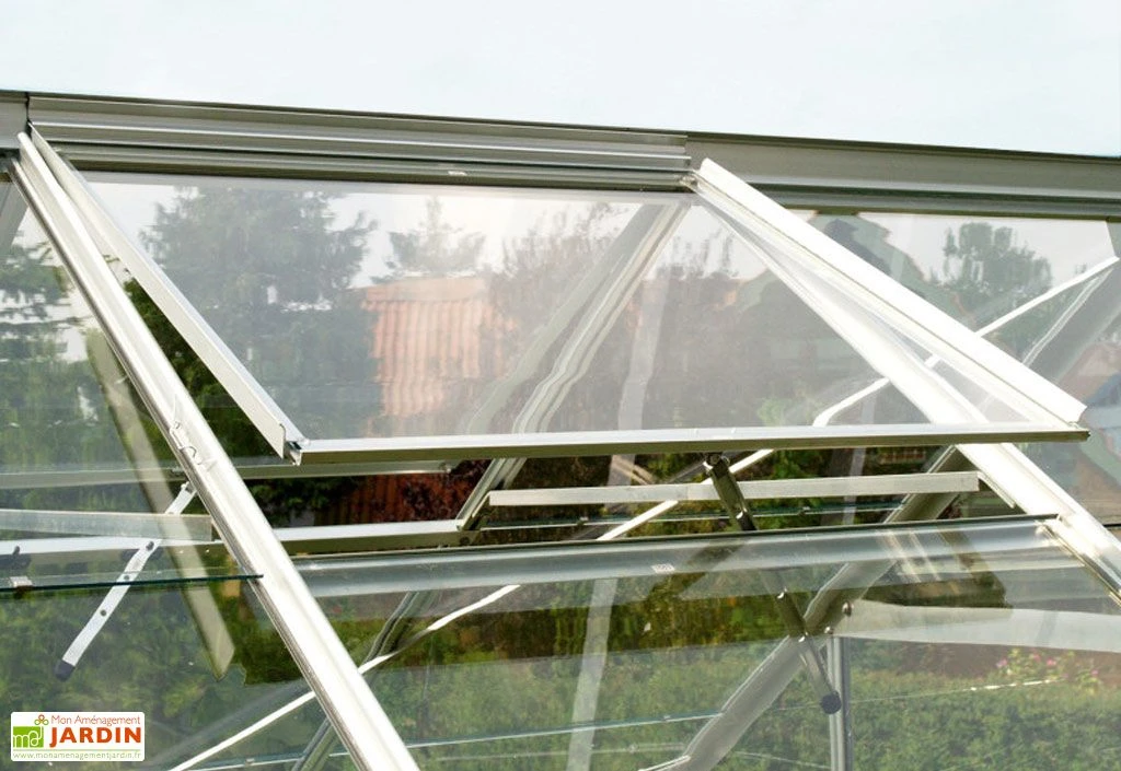 La serre en verre trempé est livrée avec une base en acier galvanisé, six fenêtres de toit, une double porte coulissante et deux descentes de gouttière.