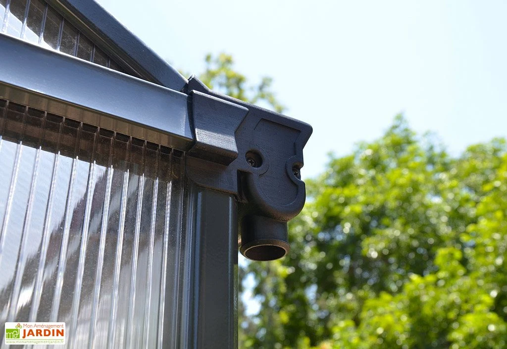 La serre de jardin Glory est équipée d’une grille de ventilation à volets mobiles et d’une fenêtre de toit avec ouverture automatisée (à partir de 12 – 15 °C). Ces deux ouvertures permettront de réguler le taux d’humidité ou la température intérieure de la serre, tout en assurant une bonne circulation de l’air. Des gouttières de 3,2 cm de diamètre se chargeront quant à elles d’évacuer l’eau de pluie, mais permettent également de récupérer cette eau afin de la réutiliser pour l’arrosage de vos végétaux. Un kit d’ancrage intérieur et extérieur est également inclus.