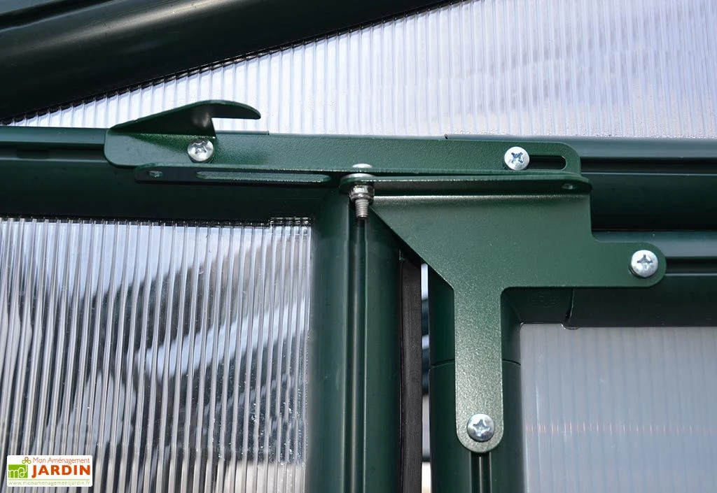 La serre en polycarbonate est équipée de 4 fenêtres de toit et d’une grande double porte qui permettent d’aérer l’intérieur de l’abri et ainsi de contrôler facilement la température et l’humidité. La double porte mesure 119 cm de largeur pour 165 cm de hauteur. Montée sur charnières, elle dispose d’une poignée et de supports permettant de la bloquer.