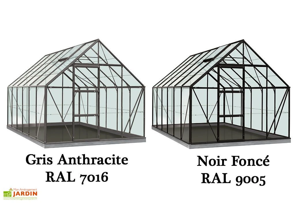 La structure de la serre est en aluminium disponible en 4 coloris. Vous pouvez choisir dans le menu déroulant parmi Aluminium brut, Vert (RAL 6009), Gris (RAL 7016) et Noir (RAL 9005). L’aluminium est un matériau qui ne demande aucun entretien et qui résiste parfaitement à la moisissure et à la corrosion. Les parois sont en verre Securit de 3 mm d’épaisseur. Plus résistant que le verre horticole, il n’explose pas en cas de casse et ses morceaux ne coupent pas.