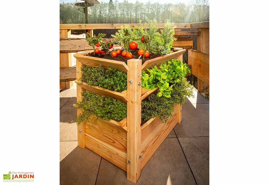 L’ensemble de cette tour de culture, structure et lamelles latérales inclinables (qui permettent d’augmenter la surface cultivable), est fabriqué en mélèze, un bois parfait pour l’extérieur puisque quasiment imputrescible. Cette essence se montrera donc extrêmement résistante en cas d’intempéries et ne craindra pas les attaques d’insectes qui pourraient détériorer le bois. Notez que le bois utilisé provient de forêts gérées de manière durable et qu’il est à ce titre certifié FSC.